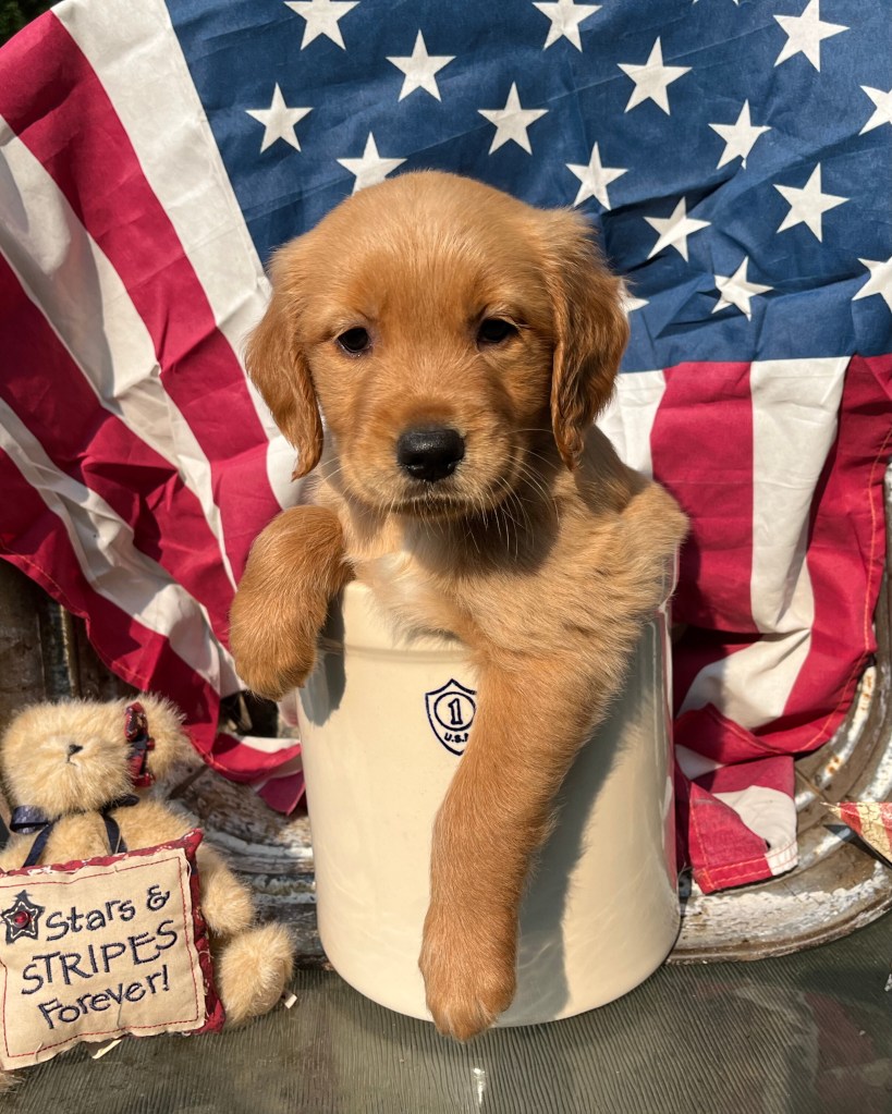 Red, white, and woof! πΊπΈππΎ Happy Independence Day from our family to yours! July 4th marked 6 weeks for our puppies. They are growing and changing so fast! π₯° We have only three females left, so please contact us if you’re interested in reserving your own purebred golden retriever puppy!